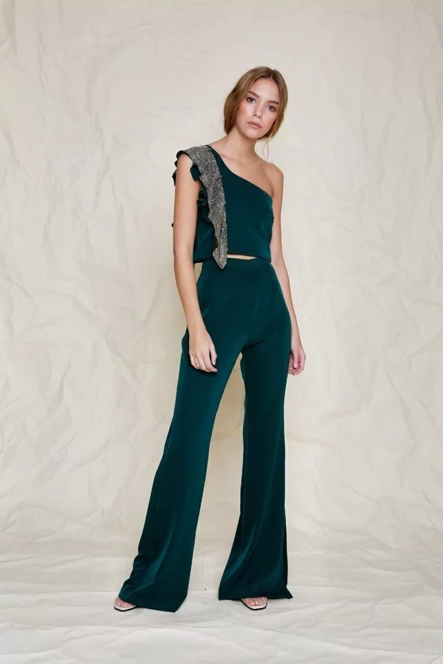 Pantalón de tiro alto en corte oxford. Con cintura recta y entallada. Tiene un tajo lateral que va desde la rodilla en una de las bota mangas que lo diferencian del clásico oxford. Confeccionado en crepe sastrero semi elastizado.
